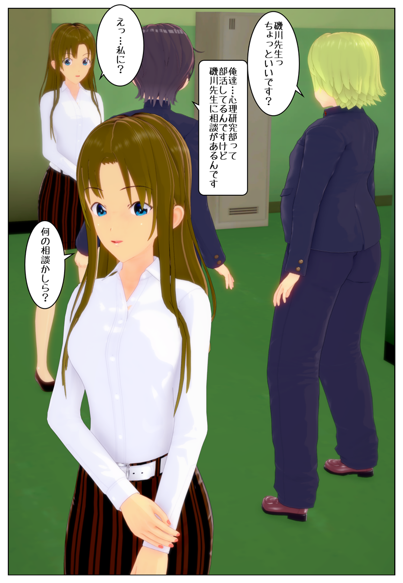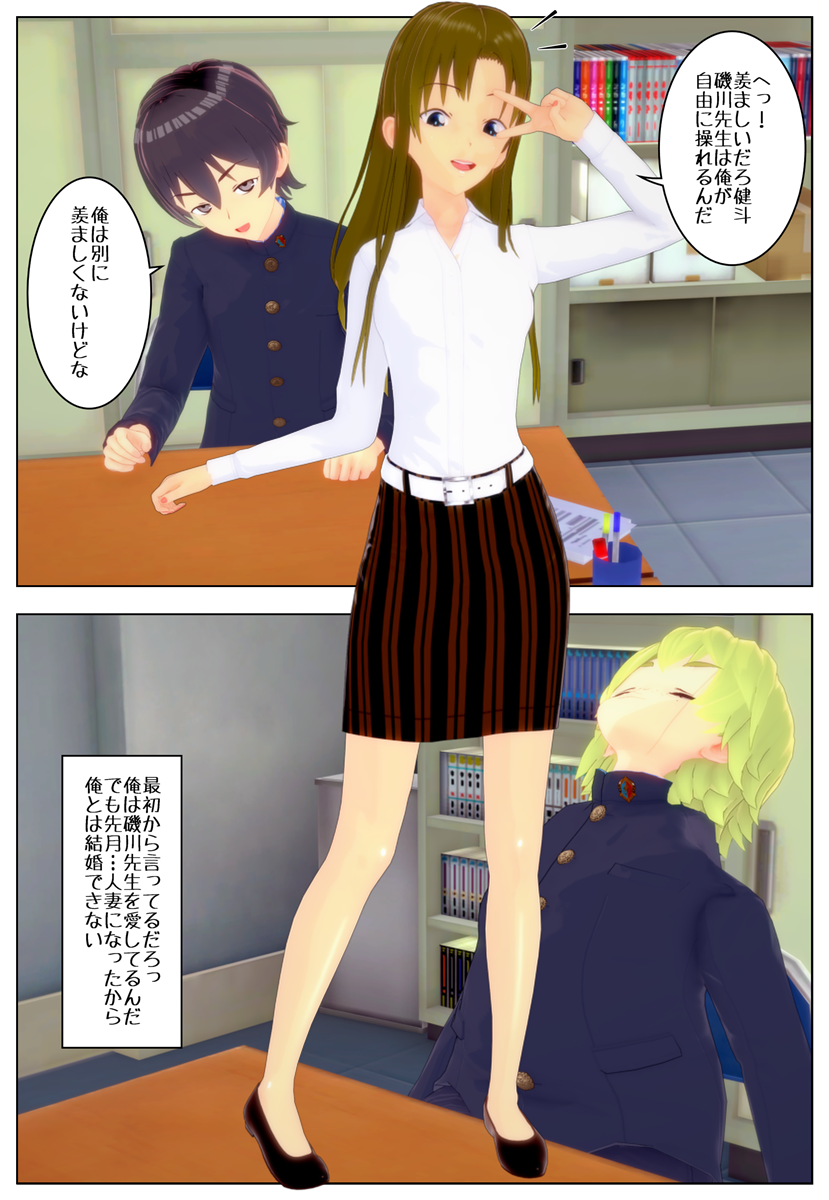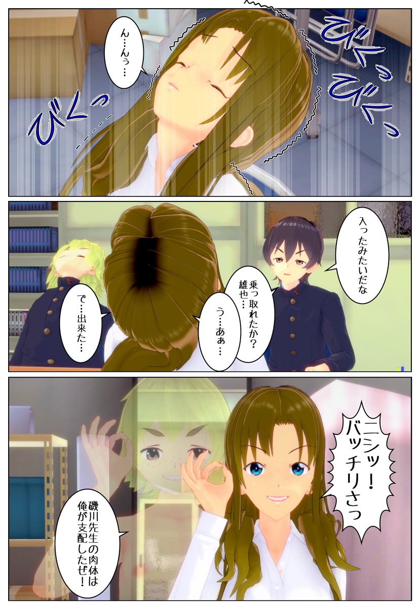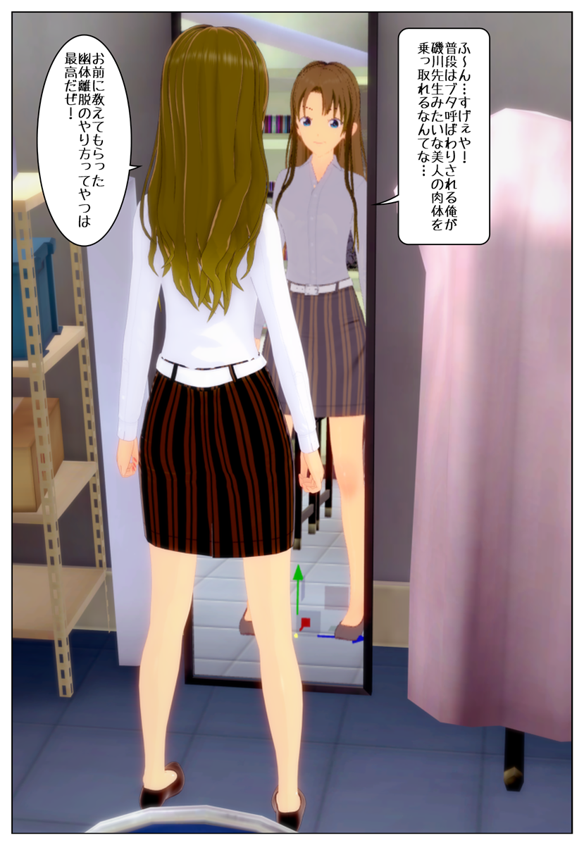 「ふ〜ん。すげぇや! 普段はブタ呼ばわりされる俺が磯川先生みたいな美人の肉体を乗っ取れるなんてな…。お前に教えてもらった幽体離脱のやり方ってやつは最高だぜ!」