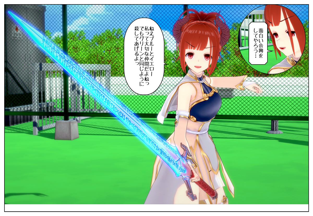 「面白い余興をしてやろう…。ねえブルーとイエロー。私って大切な仲間だよねっ。でもグリーンと同じように殺してあげるよっ」