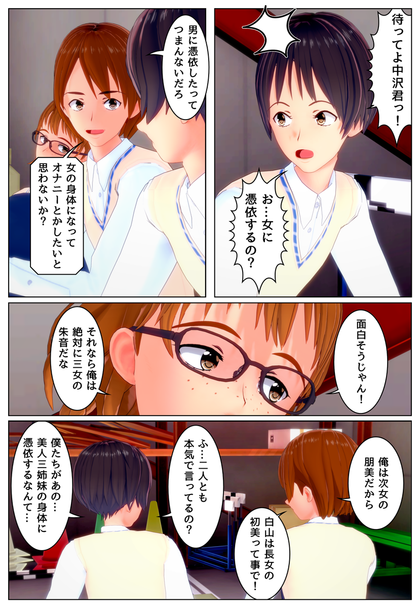 2019年11月17日 好き放題な男子達(P1-7) < 前の記事次の記事 > コメント コメント一覧 (8) 1. ペプシ 2019年11月17日 21:53 美人三姉妹への憑依。。。 何がでるかな?何をするかな? 楽しみだなぁ〜!w 0 Tira がしました 2. チラ 2019年11月17日 22:03 いぇーい! 0 Tira がしました 3. Ts 2019年11月18日 01:49 今後の展開が楽しみしかない! 0 Tira がしました 4. シェイプシフター 2019年11月18日 02:57 Tiraさん、お久しぶりです。体調を崩されていたそうですが、もう回復されましたか? 最近は天候やら気温やらの変動が激しいので、十分お気をつけ下さい。 新シリーズ、始まりましたね。個人的にTiraさんの作品では、 男女問わず霊体が全裸というシチュエーションにそそられますが、 今後の憑依作品では、支配するに至るまでの次のようなプロセスの描写があれば… と思ったりします。 男性(男子生徒)が霊体になる ↓ 女性(女子生徒)に憑依する ↓ 女性(女子生徒)の精神世界で男性(男子生徒)と女性(女子生徒)が対峙する。 もちろん一糸まとわぬ全裸で。 ↓ 男性(男子生徒)が女性(女子生徒)を封じ込めて憑依完了。 …とまあこんな感じです。 何か自分の妄想を書き連ねてしまって申し訳ありません。 もしTiraさんの今後のネタの一助になってもらえたら幸いです。 今後も応援していきますので、無理しない範囲で創作をして下さいね。 0 Tira がしました 5. Anomyous 2019年11月18日 07:00 Please text 0 Tira がしました 6. Tira 2019年11月18日 23:50 >ペプシさん コメントありがとうございます。 もう楽しむ事しか考えていません(笑 >チラさん ありがとうございます〜! >Tsさん ありがとうございます。 また続きも校正できたら掲載します〜! >シェイプシフターさん こんばんは! お久しぶりです。 体調は回復しましたよ。 書かれたシチュエーションは、以前作った「分魂2!」に出てきたイメージですね。 DATEさんの「他人になるクスリ」も同じような感じでしょうか。 今回の作品ですが、実はすでに60ページほど作っており、校正できた時点のページまでを掲載しているところです。 すでに憑依シーンは出来ているので修正はできないのですが、またいつかその様なシチュエーションも検討してみたいものです。 >Anomyousさん また時間が出来たら日本とテキストを掲載したいと思います。 0 Tira がしました 7. Jy 2019年11月20日 15:10 Can you please add text under the image? 0 Tira がしました 8. Tira 2019年11月24日 08:39 >Jyさん また時間が出来たら掲載します。 0 Tira がしました コメントフォーム 名前 コメント 記事の評価 リセット リセット 顔 星 情報を記憶 コメントを投稿する