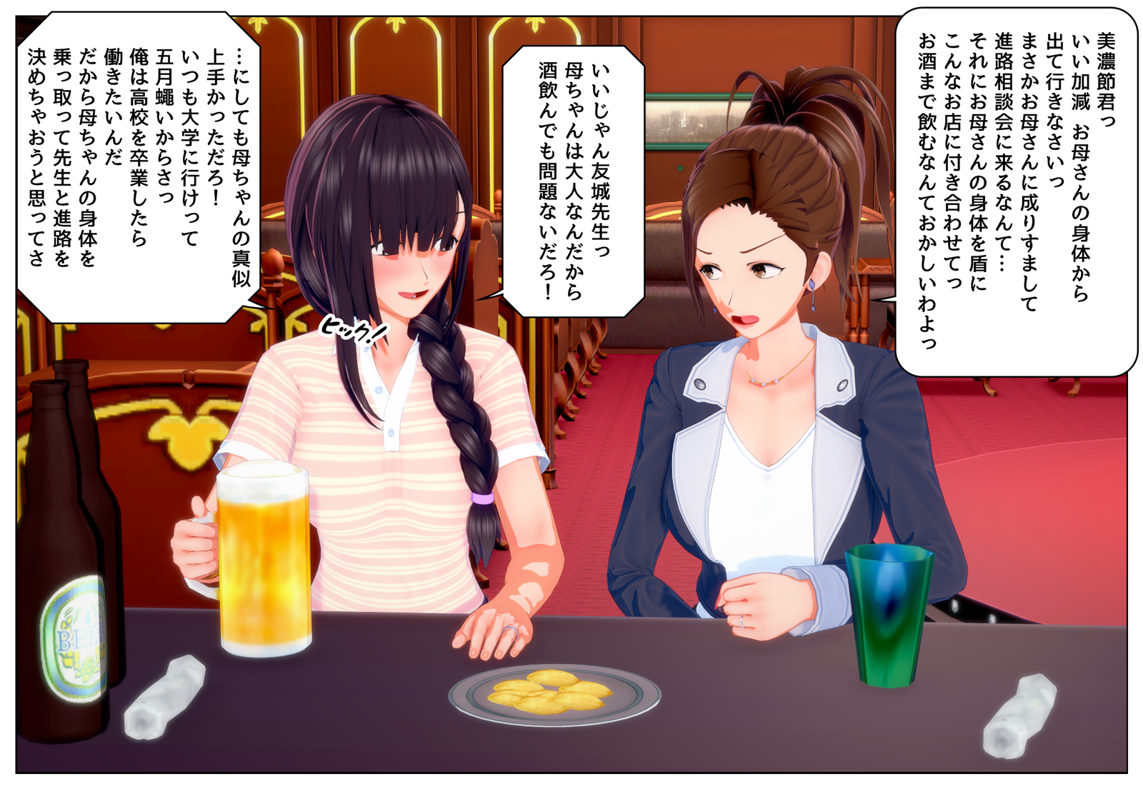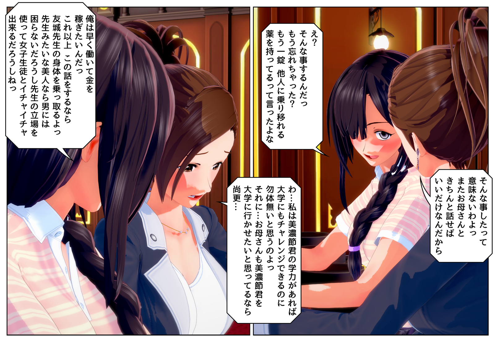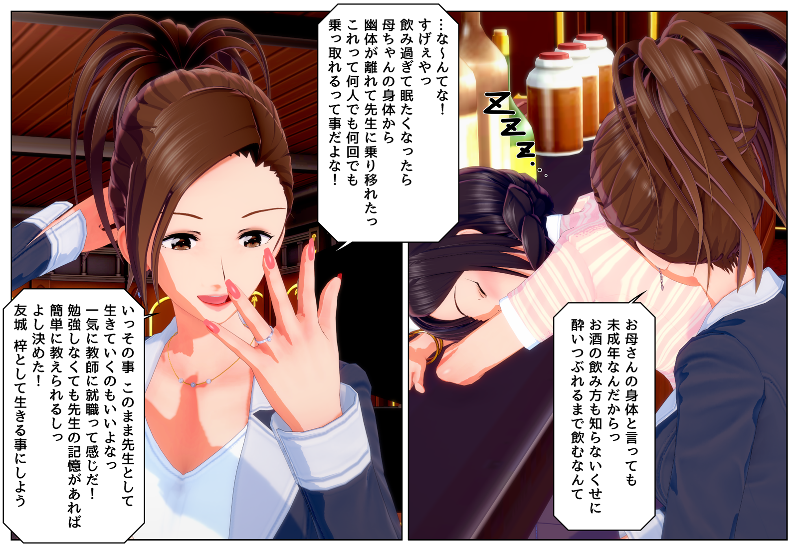 2021年11月03日 大学に行きたくない男子生徒が母親に成りすまして進路相談会に行く < 前の記事次の記事 > コメント コメント一覧 (5) 1. 黒雪雨 2021年11月03日 22:10 これ好き! さりげなく乗り換えて先生として生きよう…とみせかけて今度は生徒に乗り換えて 次々と渡り歩いていきそうで 続編希望! 0 Tira がしました 2. ケロ 2021年11月04日 23:14 「男には困らない。」という発言から両刀使いっぽいですね。 左手薬指に指輪がありますから、既婚者ですかね。 旦那や他の男を作ってガシガシセックスして欲しいですね。 個人的には、子供作って女の幸せを先生の体で掴むなんてのも面白そう。 0 Tira がしました 3. Tira 2021年11月06日 09:33 >黒雪雨さん 女子陸上部の生徒を会議室に呼んで、一通り楽しんだ後に彼女を乗っ取り、更には彼女の姉か母親に乗り移って……みたいに乗り移ってゆくのも面白いですね! >ケロさん 男性と行為をする事には抵抗が無いみたいですね! 昨夜は旦那とやりまくったのかもしれません(^^ 0 Tira がしました 4. 黒雪雨 2021年11月07日 10:40 一回一錠と言って 本当は1錠で十分で 寝たら身体から抜けれるってことだったのかな それならこのあと、次々とお楽しみできますね 今後これの続編ショートバージョンでもそいいので その後、次々と乗り換え渡りでるの期待してます 0 Tira がしました 5. Tira 2021年11月07日 23:56 >黒雪雨さん きっと、彼は色々な女性に乗り移る人生を歩むんですよ。 残りの1錠は、親しいツレにあげて、二人で女性の身体を堪能しまくるという、悪い奴らになるんです(笑 0 Tira がしました コメントフォーム 名前 コメント 記事の評価 リセット リセット 顔 星 情報を記憶 コメントを投稿する