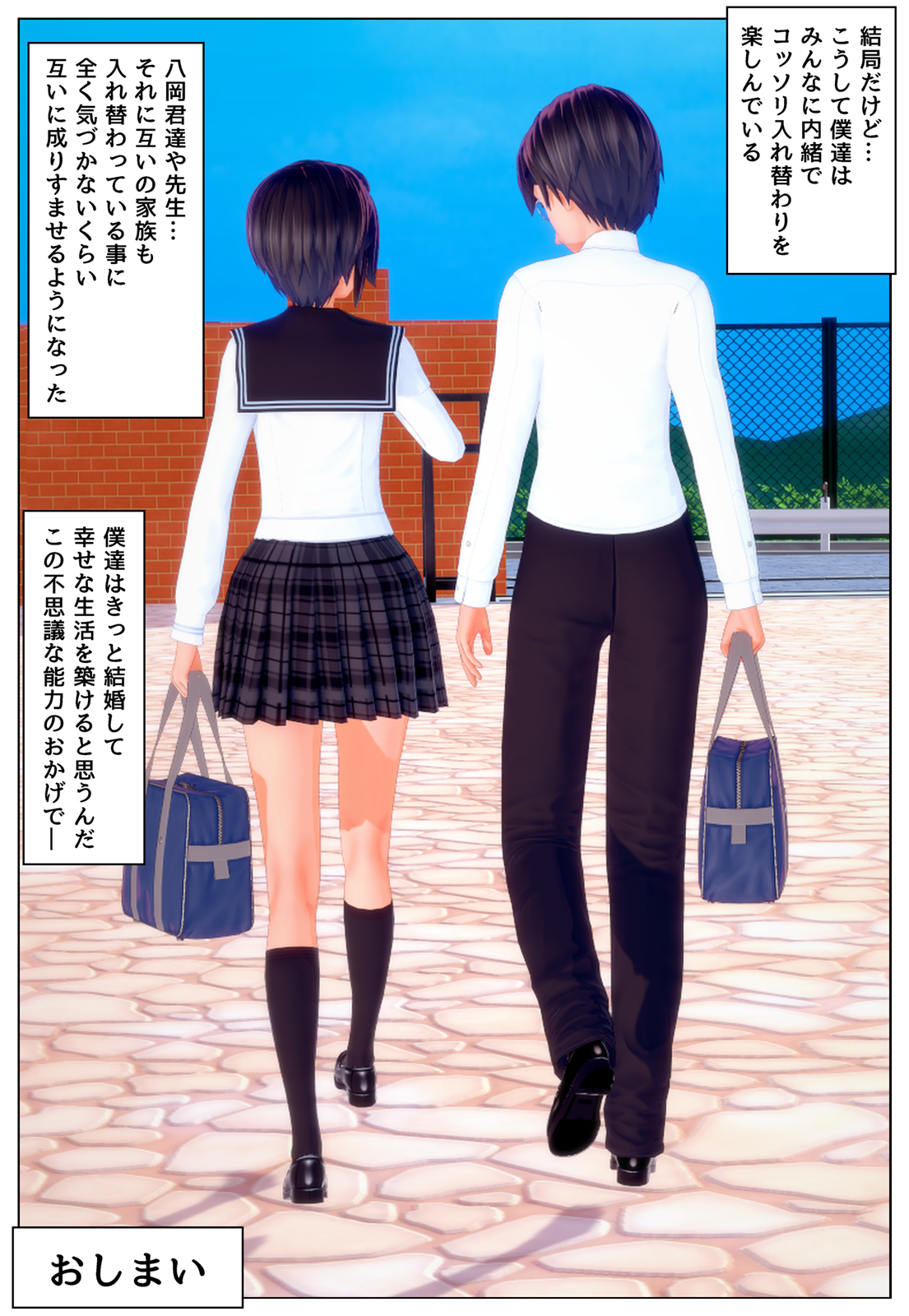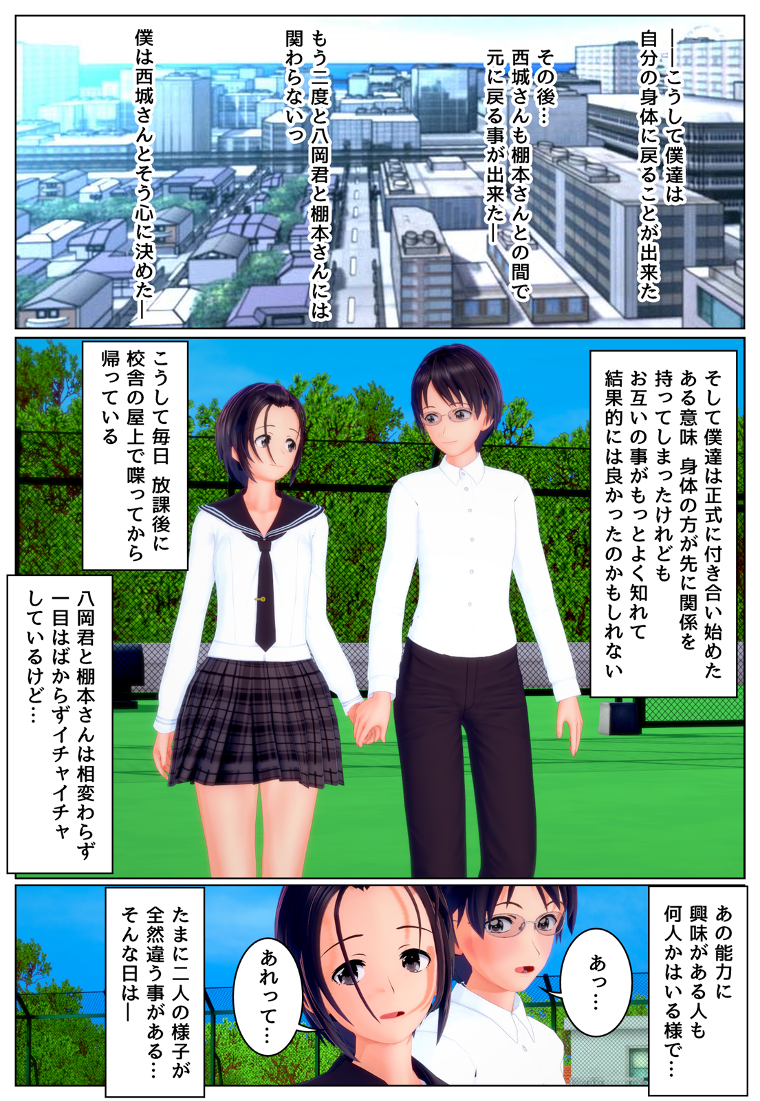 2022年03月17日 きっかけ(P68-完結) < 前の記事次の記事 > コメント コメント一覧 (4) 1. 黒雪雨 2022年04月29日 17:30 おかえりなさいませ! 無事ハッピーエンド(?)みたいですね あの2人は色々な人と入れ替わって行内でも噂が広まり日々入れ替わってるのでしょうね 0 Tira がしました 2. Tira 2022年04月30日 08:17 >黒雪雨さん 久しぶりに更新を始めます! 色々迷いながらもハッピーエンドにしました。 もう、この学校は誰が誰か分からなくなるかもしれませんね(笑 0 Tira がしました 3. イロナ 2022年05月08日 13:41 凄く良かったです!予想外でしたけどハッピーエンドもいいですね。個人的には西城さんになった八岡くんが優等生ぶるところも見たかったなと思います。 0 Tira がしました 4. Tira 2022年05月08日 15:35 >イロナさん ありがとうございます! 楽しんでいただけて良かったですよ。 私が作る作品はダークな展開が多いですが、今回はハッピーエンドで終わりました。 八岡君が西城さんのマネをするのってどんな感じだったんでしょうね!? たまにボロを出していたのかもしれません! 0 Tira がしました コメントフォーム 名前 コメント 記事の評価 リセット リセット 顔 星 情報を記憶 コメントを投稿する