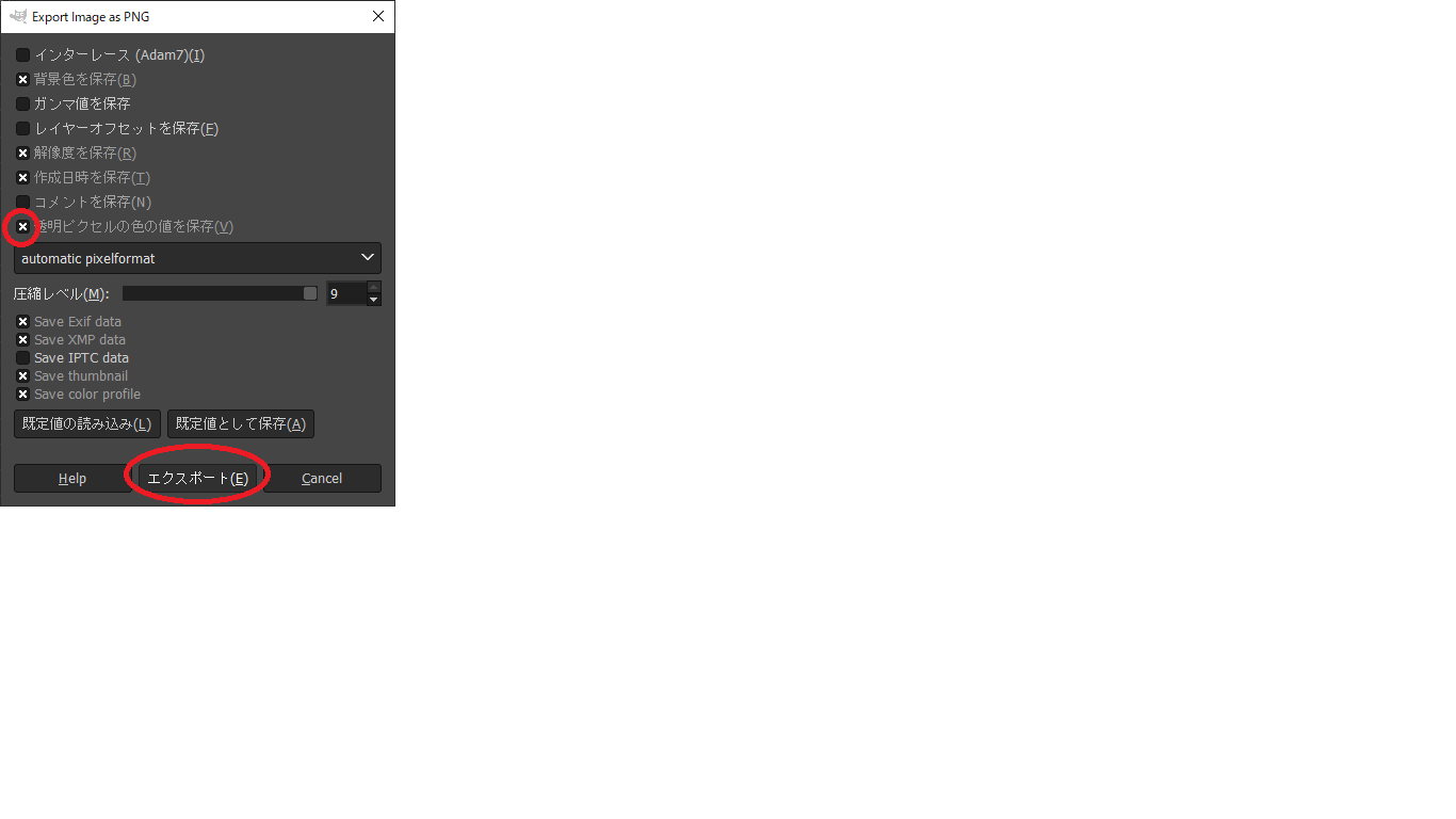 「ファイル」から「名前を付けてエクスポート」を選択し、適当な名前でエクスポート(保存)します。保存する際に、「透明ピクセルの色の値を保存」にチェックを入れておきます。